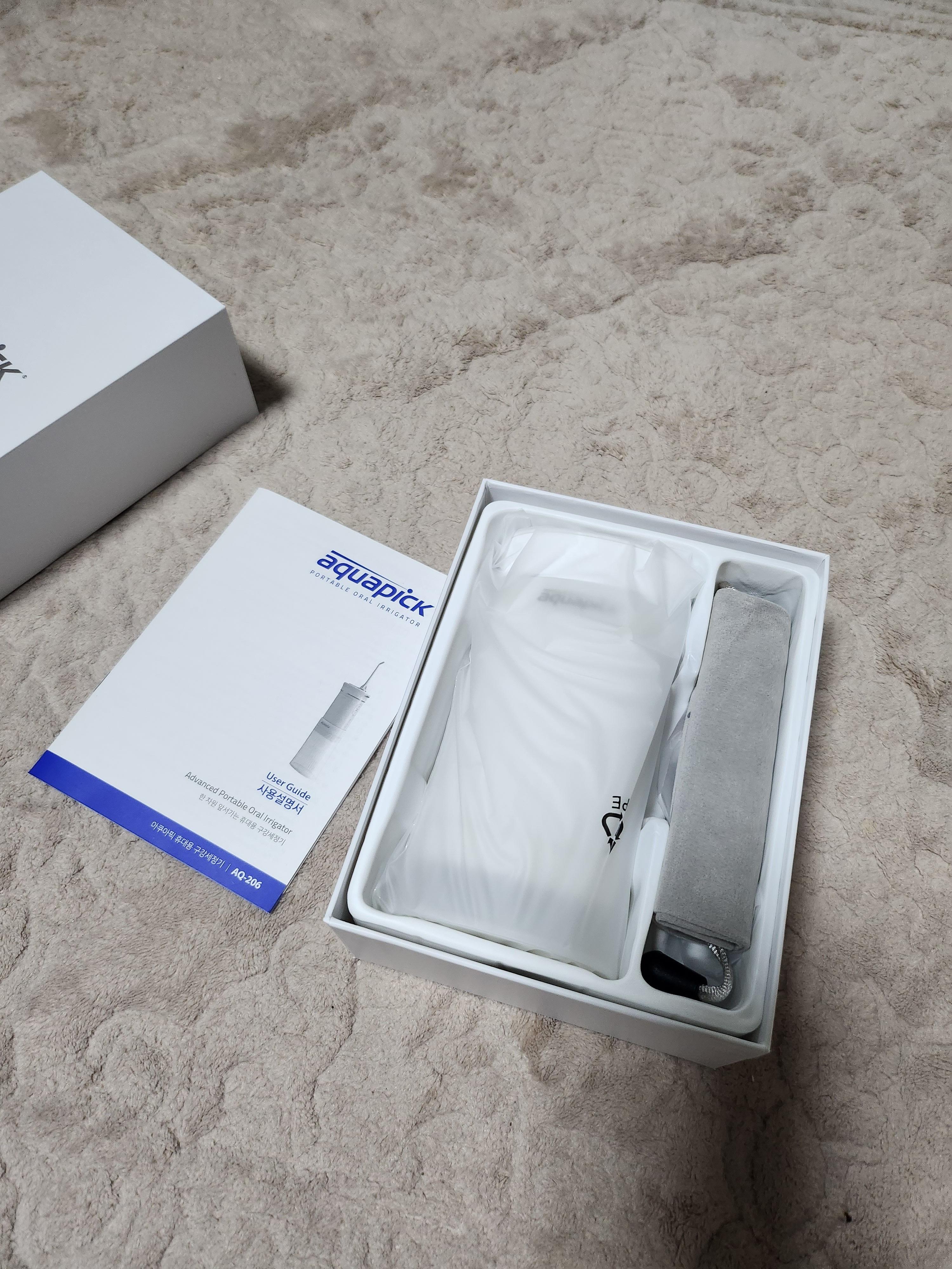 본체 박스 열어보니 아쿠아픽 AQ-206 본체와 파우치, 제트팁 2개, 충전 케이블 들어있어요