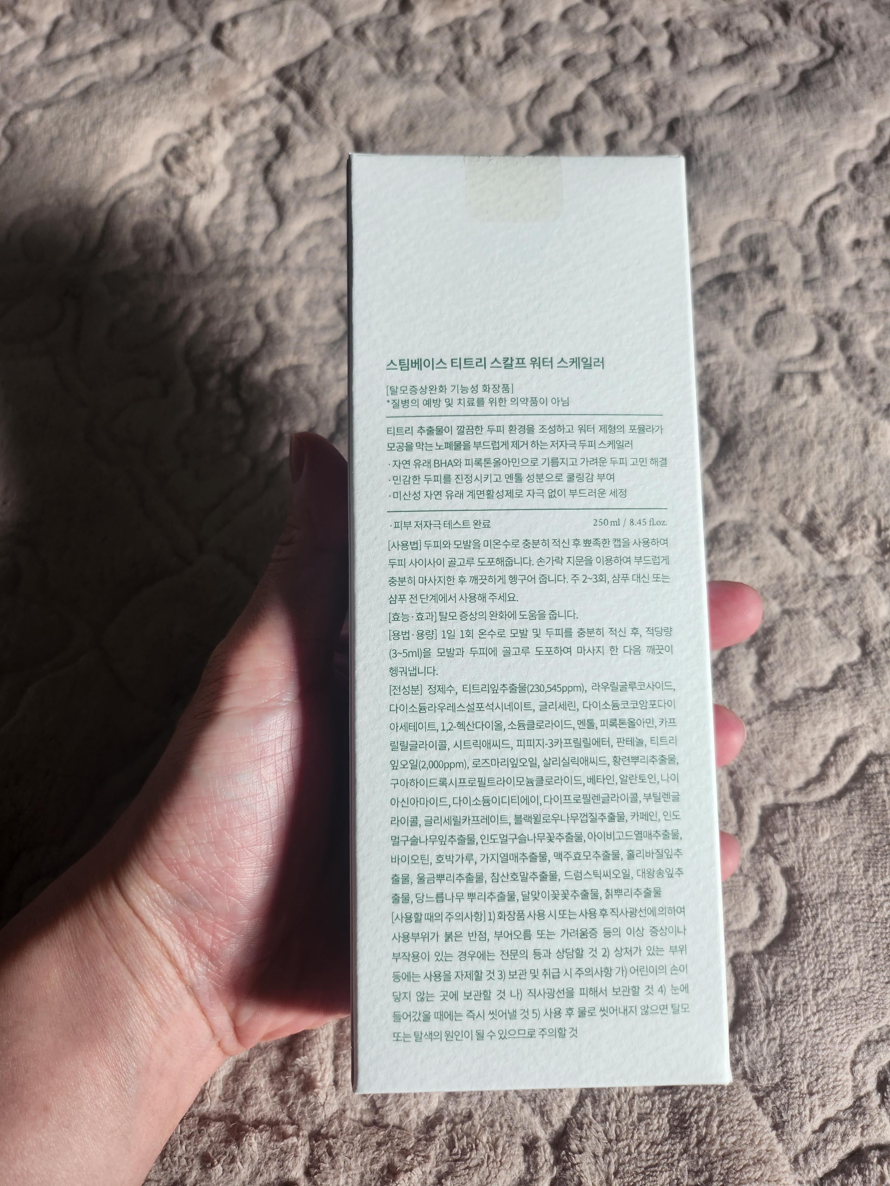 이번에 스팀베이스 티트리 스칼프 워터 스케일러 두피스케일링 탈모완화기능 250ml 제품을 구매했어요.