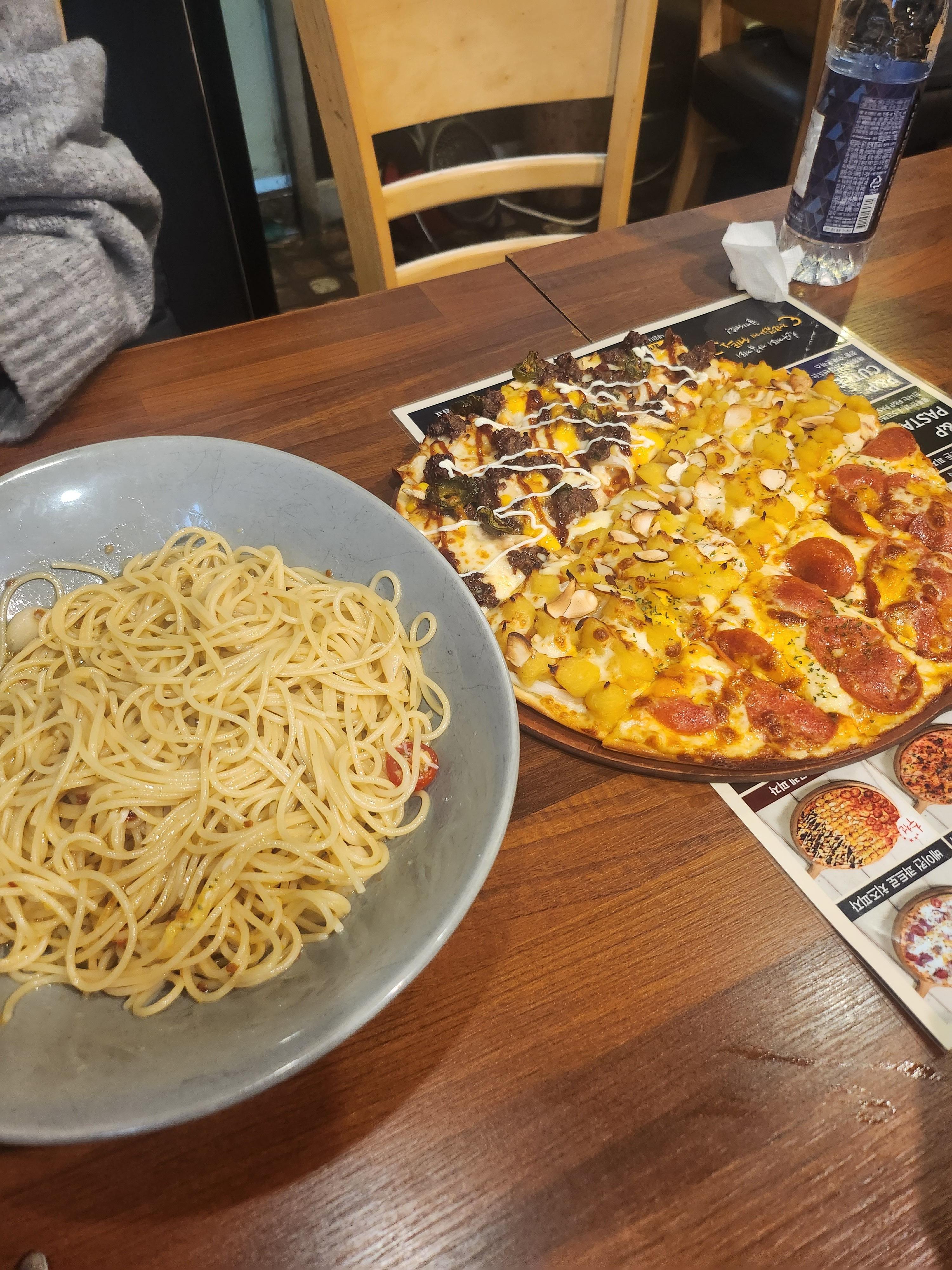 둘이가서 피자 미디움 파스타 하나 클리어 했는데 배가 엄청 빵빵했어요