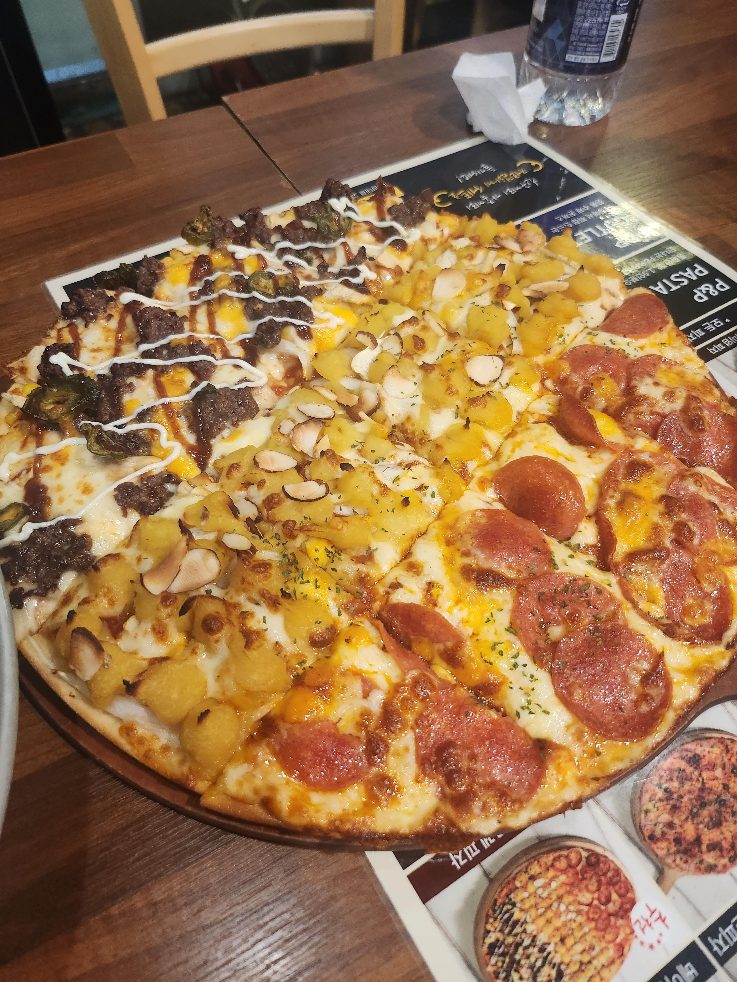 세가지 맛으로 만들어진 피자 페퍼로니, 고구마, 불고기