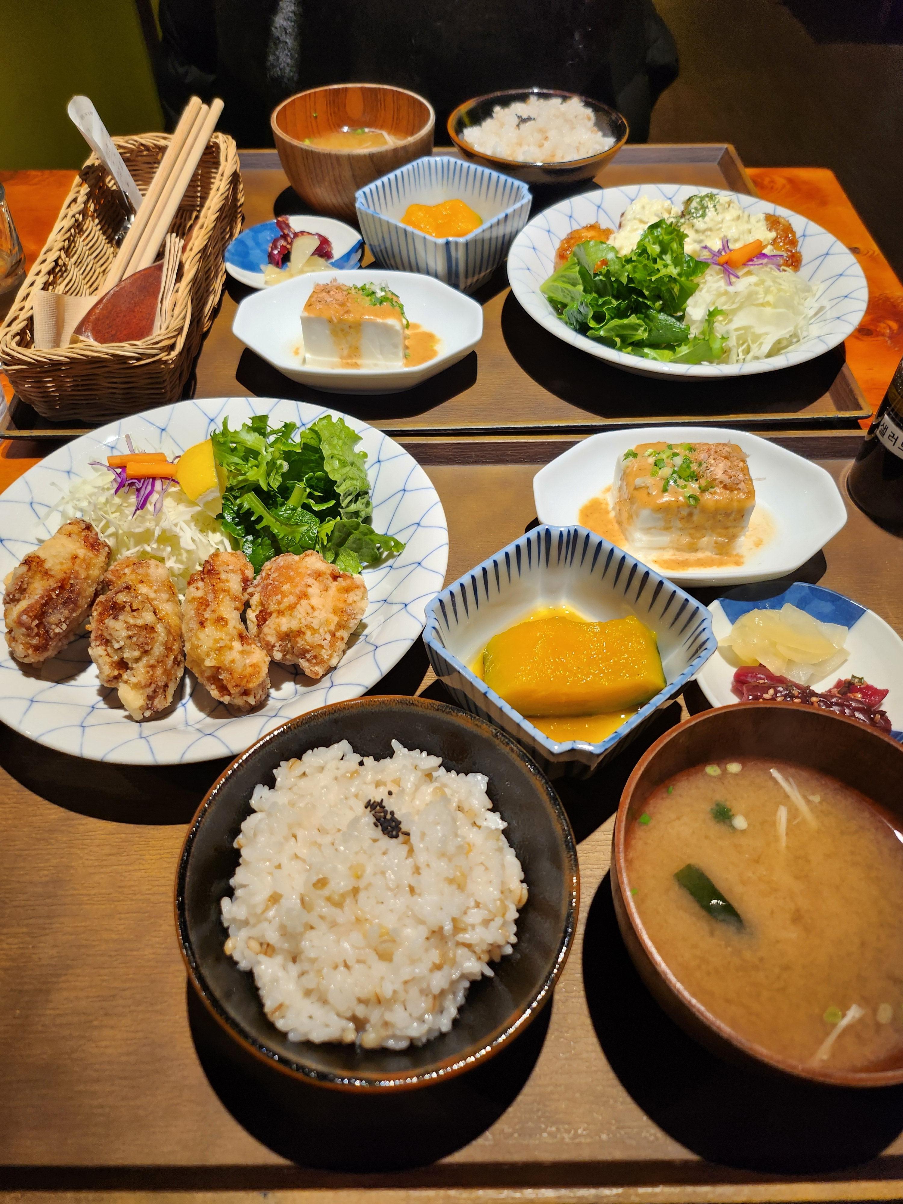 샐러드 드레싱과 후추는 따로 주고 가라아게 정식이랑 치킨난반 정식 비슷해 보이지만