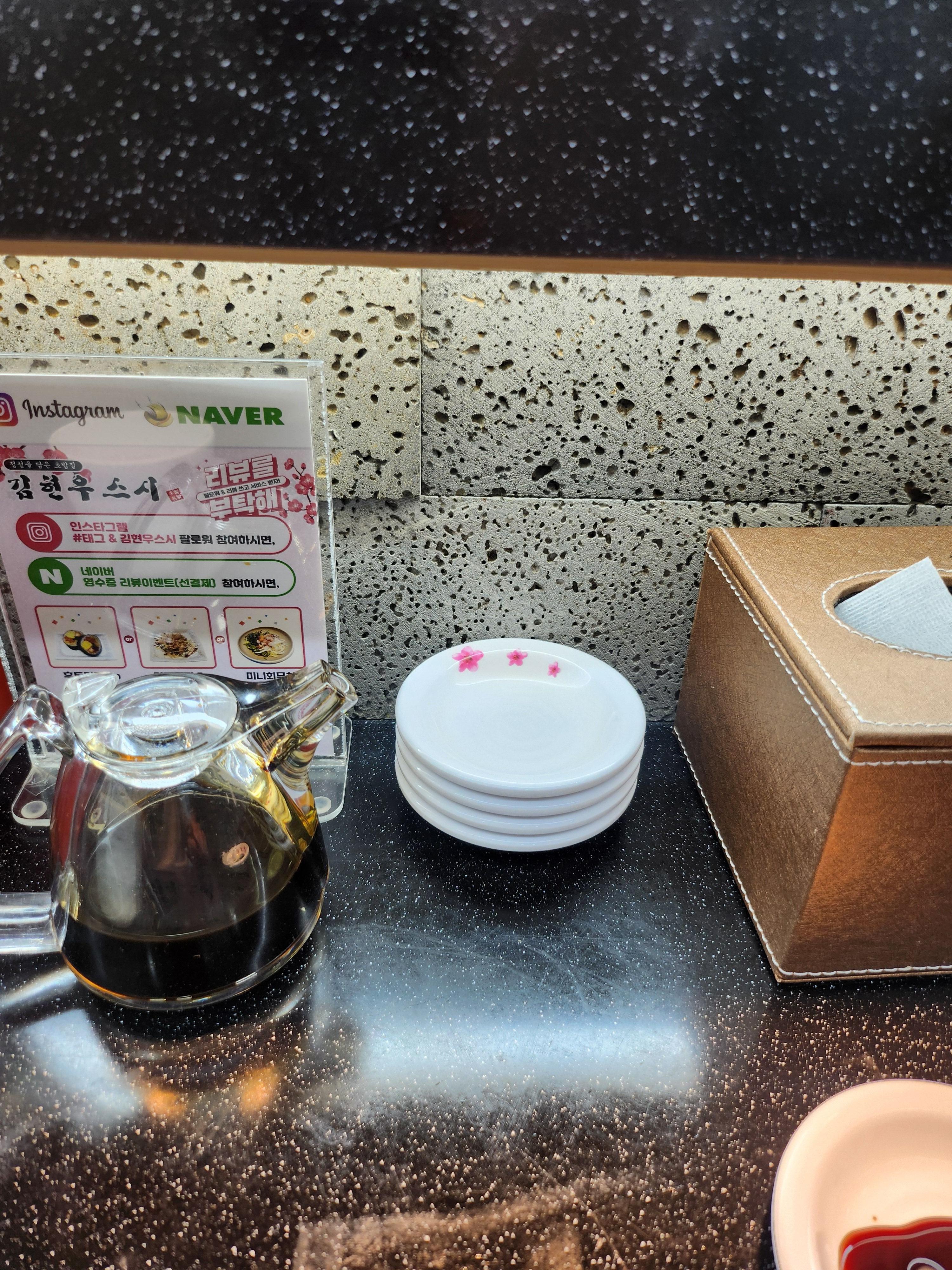 테이블에 종지랑 간장 그리고 락교 생강 냅킨 이렇게 있고