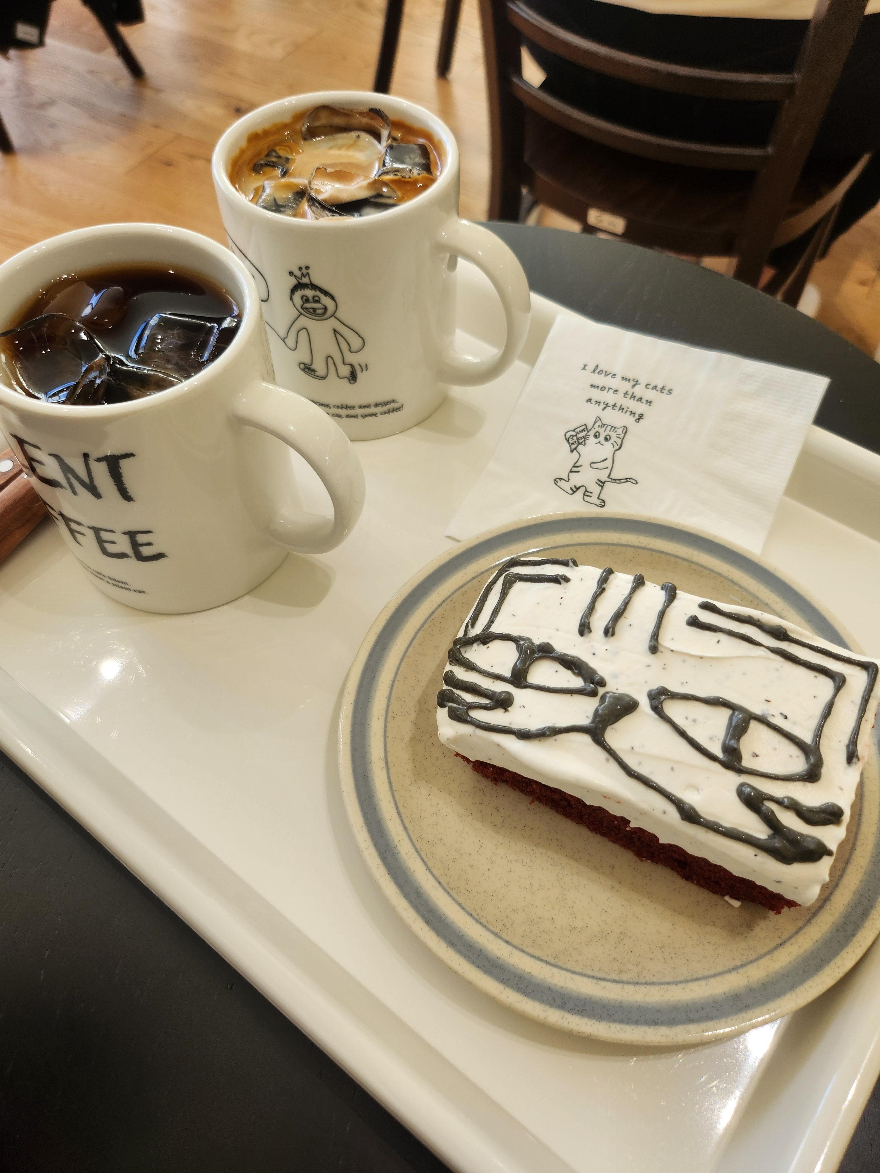 둘이가서 고양이가 그려진 케익이 뭐냐고 물어보니까 레드벨벳 케이크라고 말해주셔서