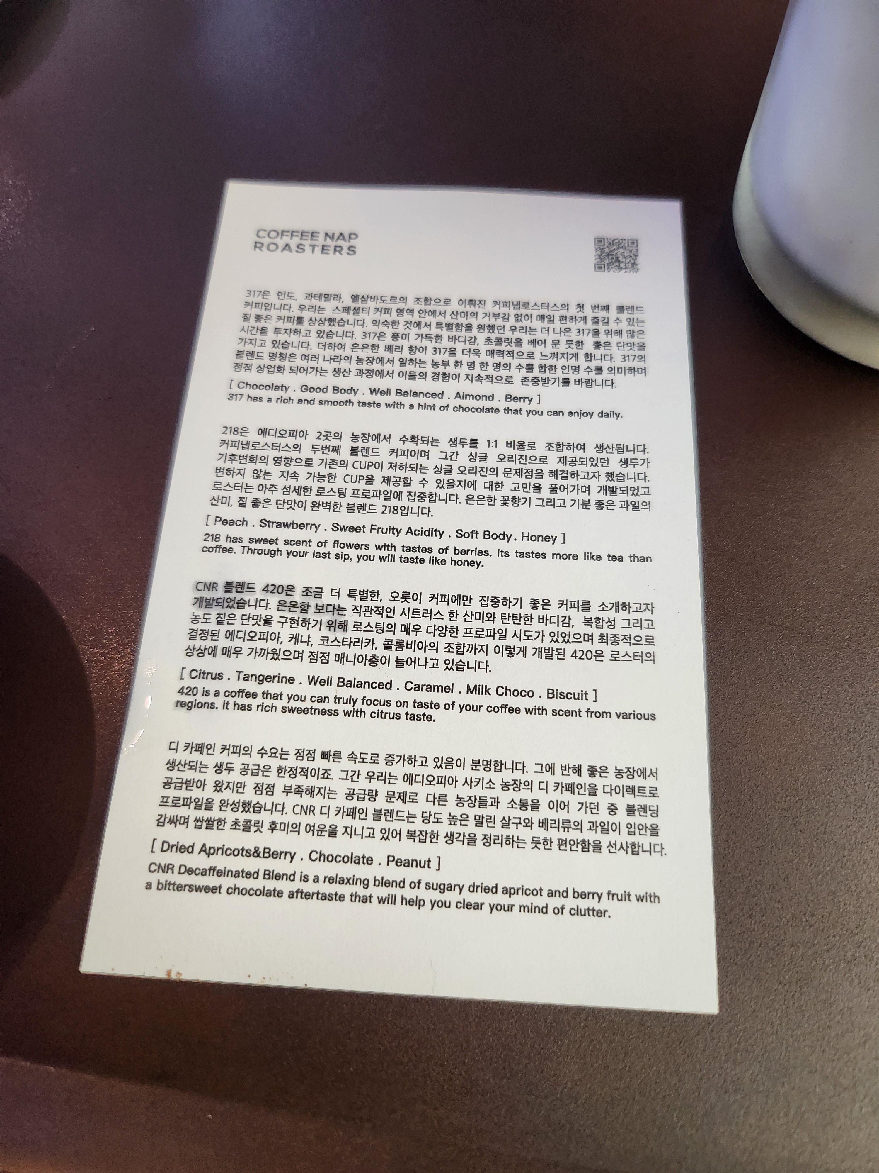 원두 종류별 설명도 이렇게 줘서 읽어 보면서 먹었습니다
