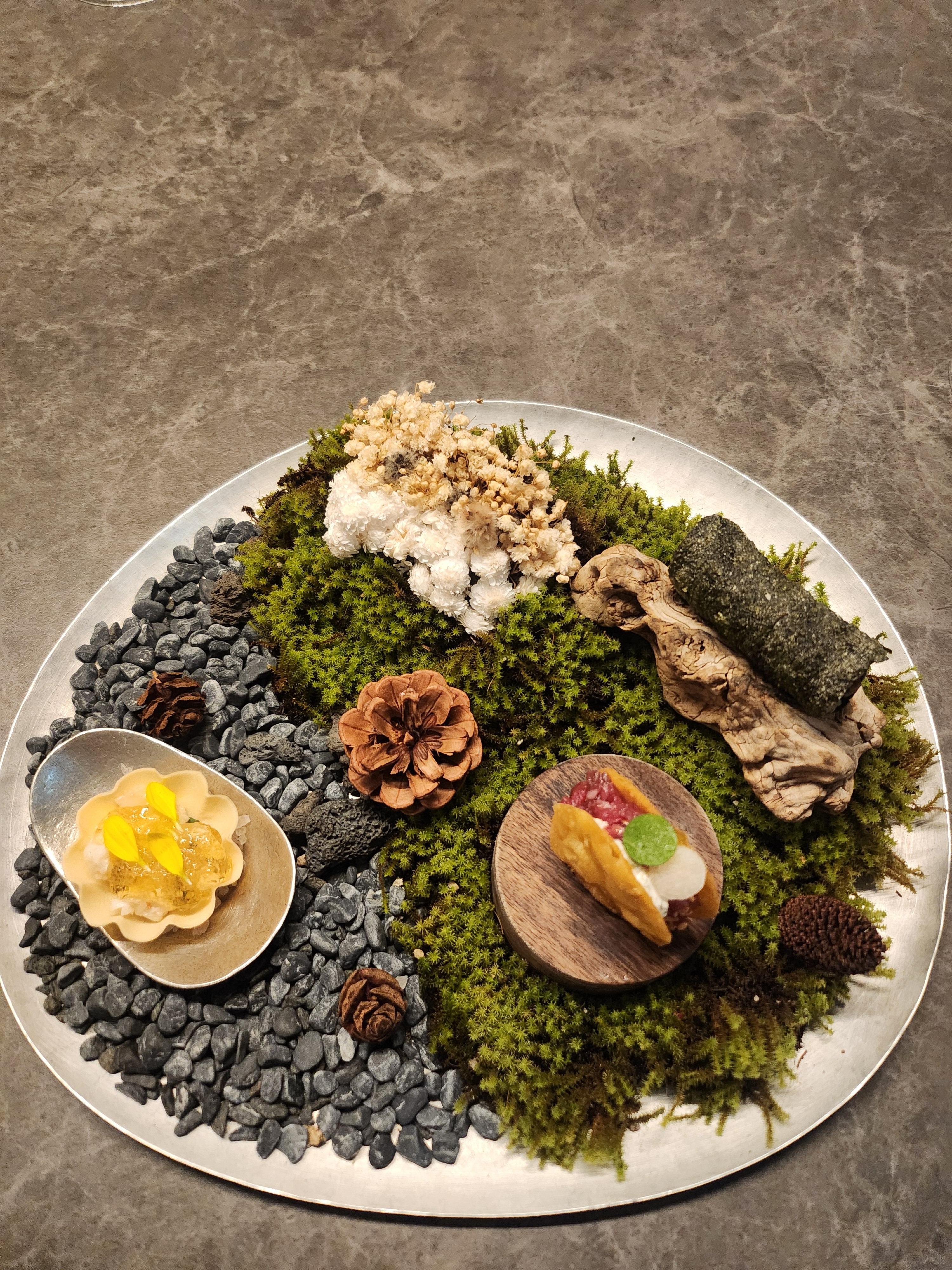 가장 왼쪽이 랍스터타르트 그리고 김부각에 말려있는게 불고기 가운데는 한우 육회